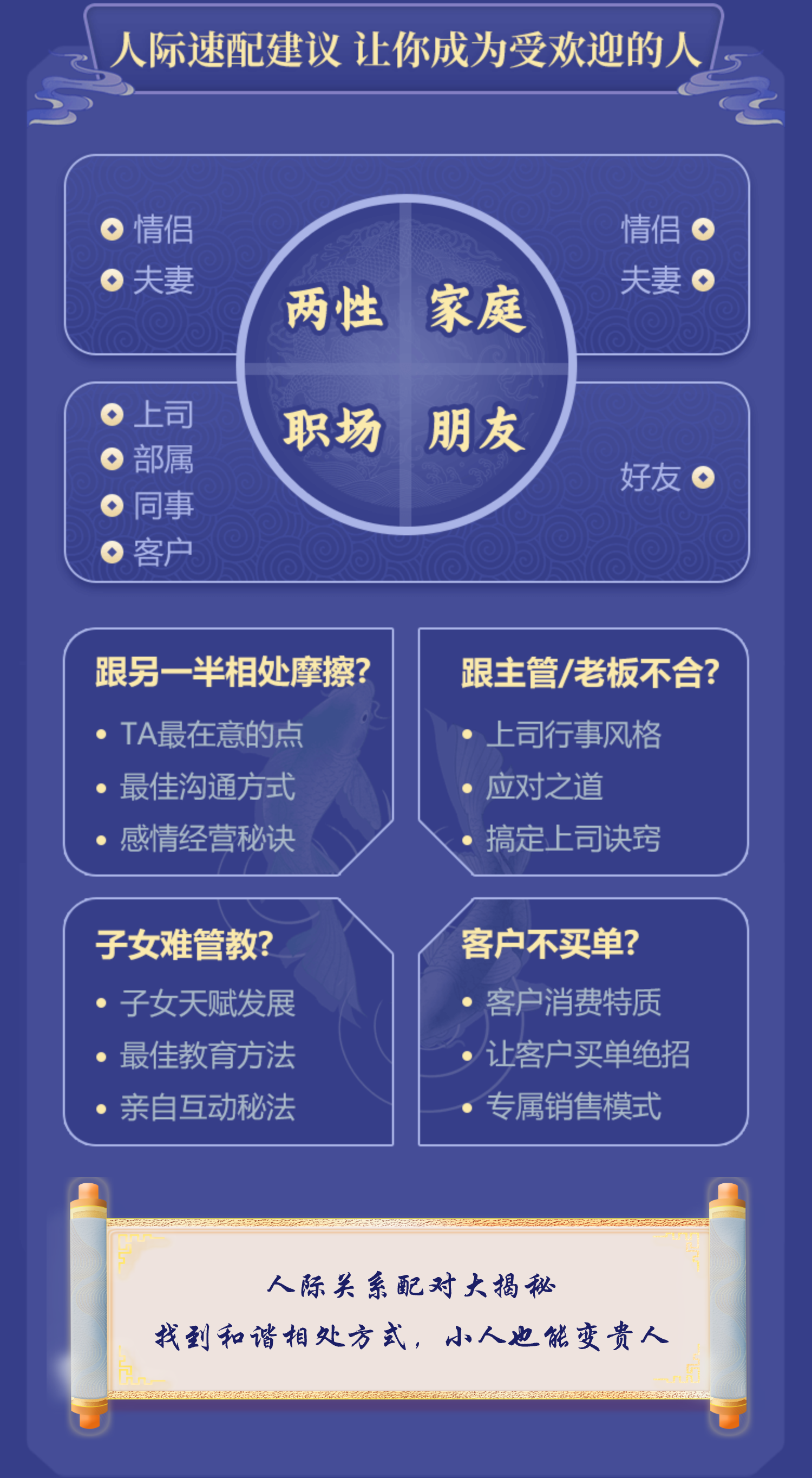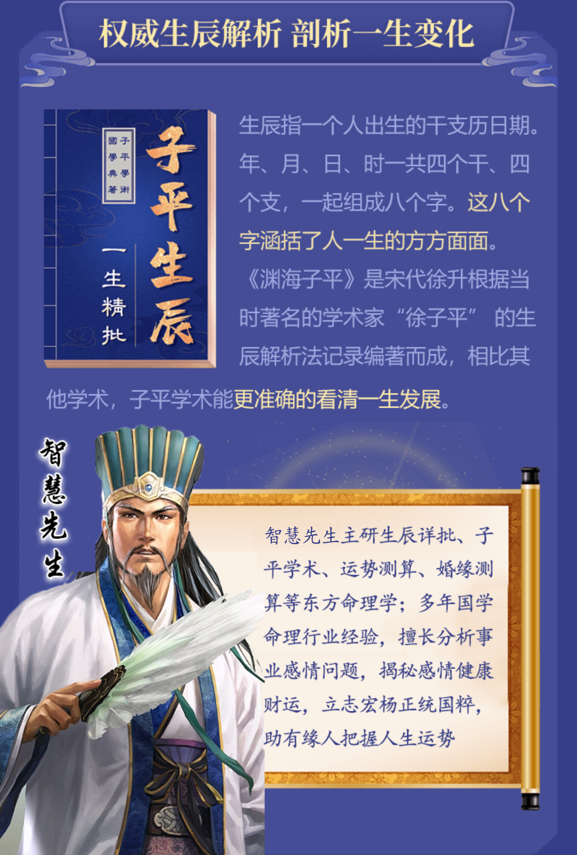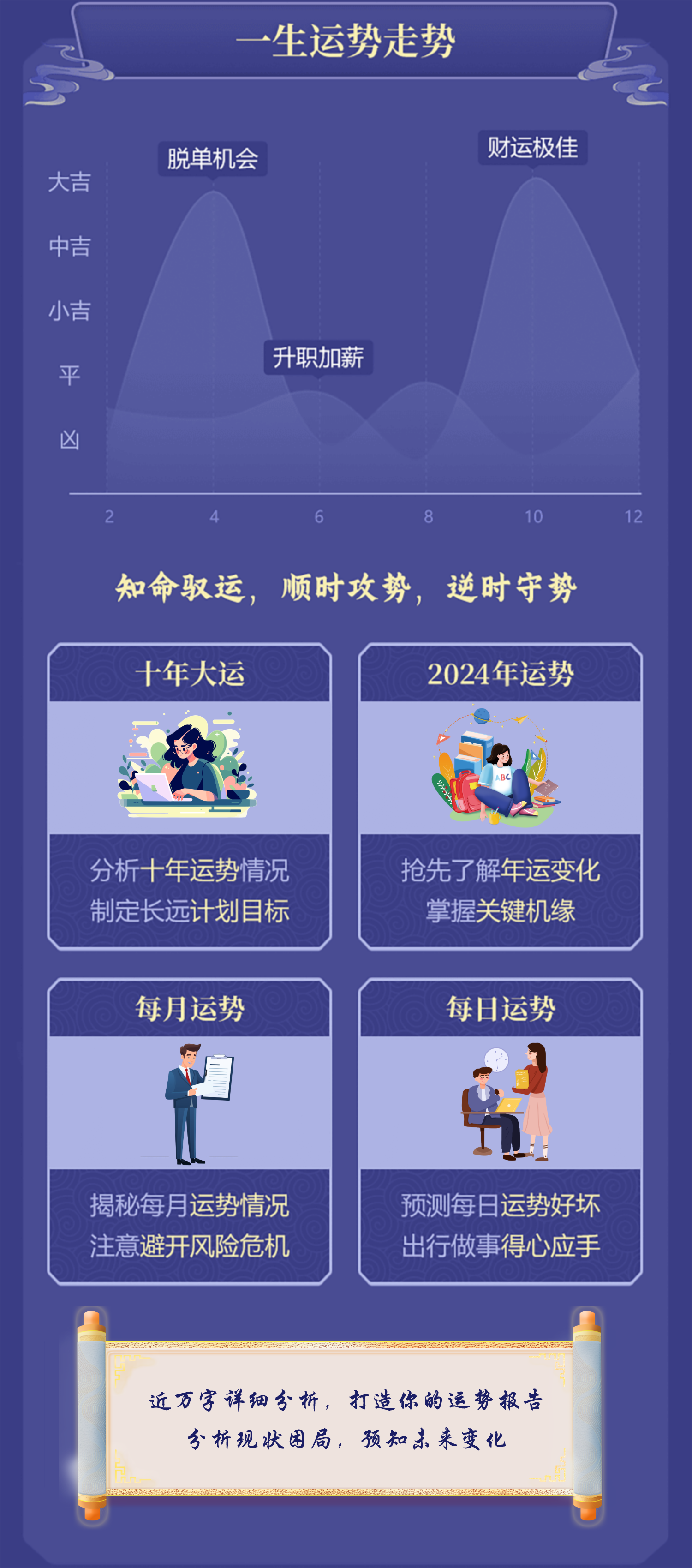 2、在您体验测算服务时,我们需要获取您的姓名和生辰命格(出生日期),为了保证数据准确性,我们建议您提供真实的个人信息,若您提供的信息有错误,会对测算结果的准确性造成偏差。我们保证您的所有个人信息除了用于生成测算数据以外,不会用于其他用途。
